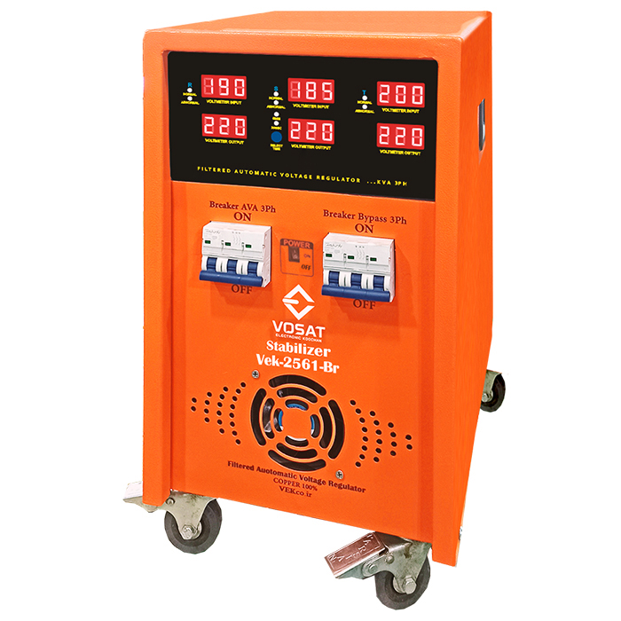 دستگاه استابیلایزر 16.5 کیلو ولت آمپر مدل vek16.5kvaavr55a×3ph به گونه ای طراحی شده است که به بهترین نحو میتواند از دستگاه ها و لوازم برقی در مقابل نوسانات و اختلالات برق شهر و خطرات ناشی از رعد و برق و... محافظت نماید